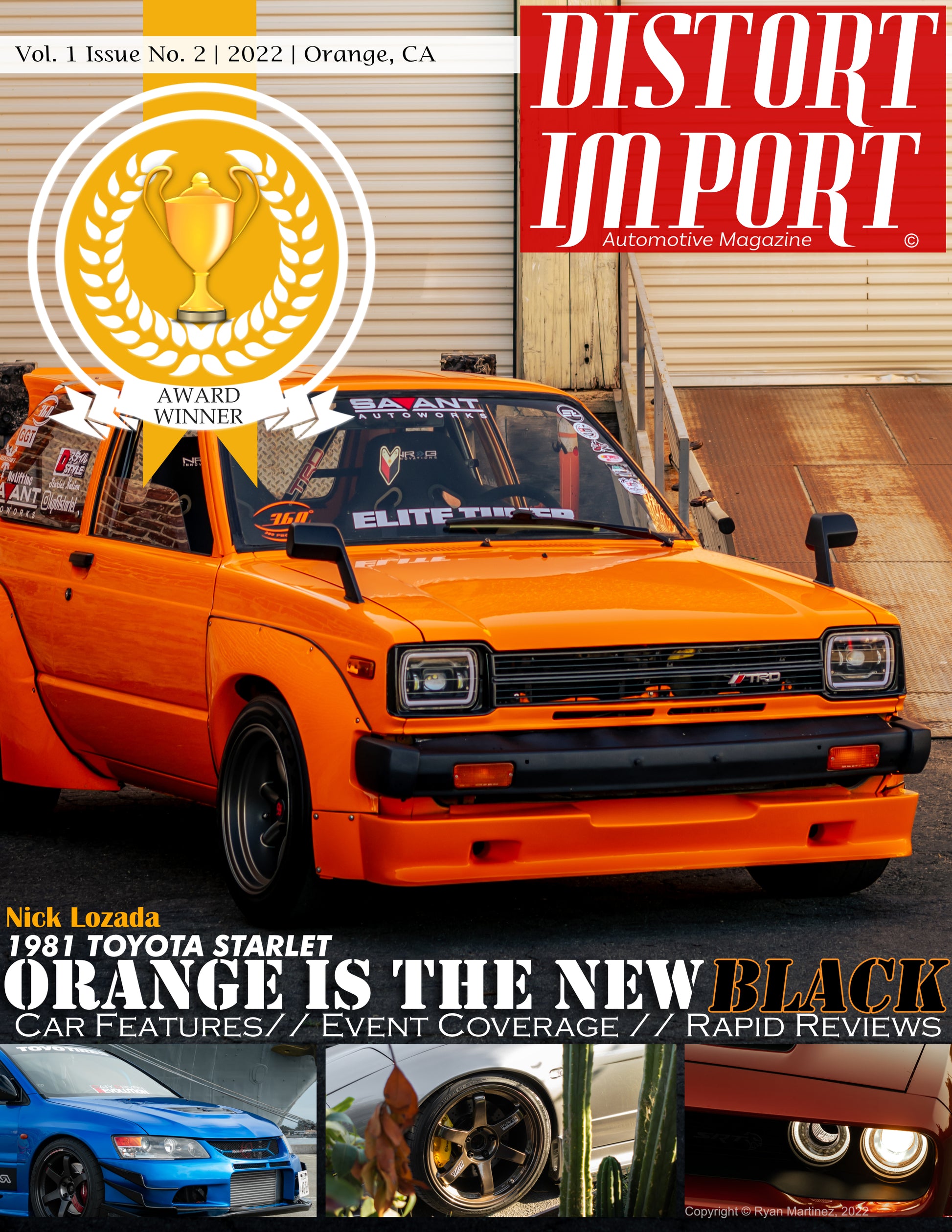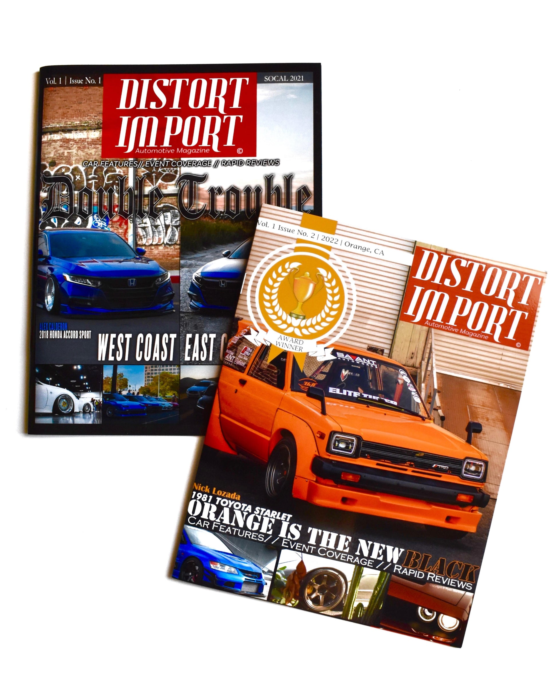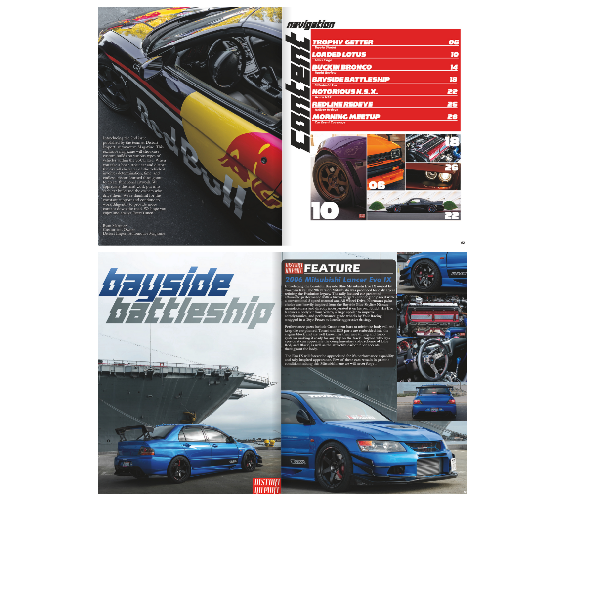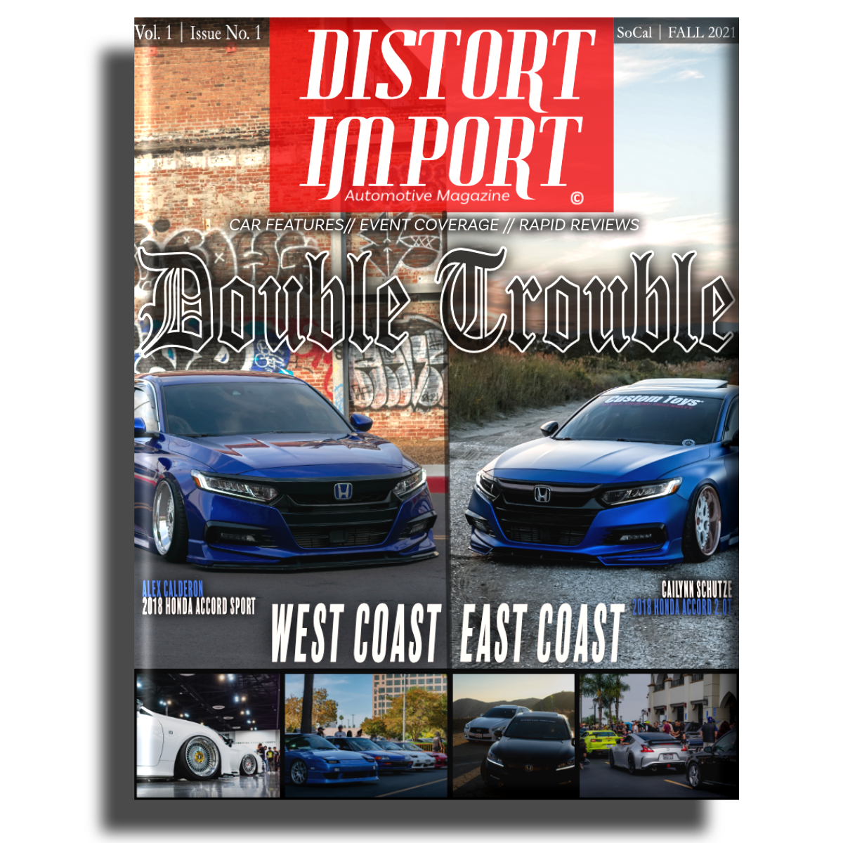 Distort Import is proud to present its initial release of a car enthusiast magazine which displays exclusive automotive car features, rapid reviews on the latest vehicles, and event coverage within the SoCal area. These printed magazines include various pages of eye-catching cars which have been modified in their own unique way. The car owners provide background on their ride with exclusive info to show off the hard work and dedication they have built over time.